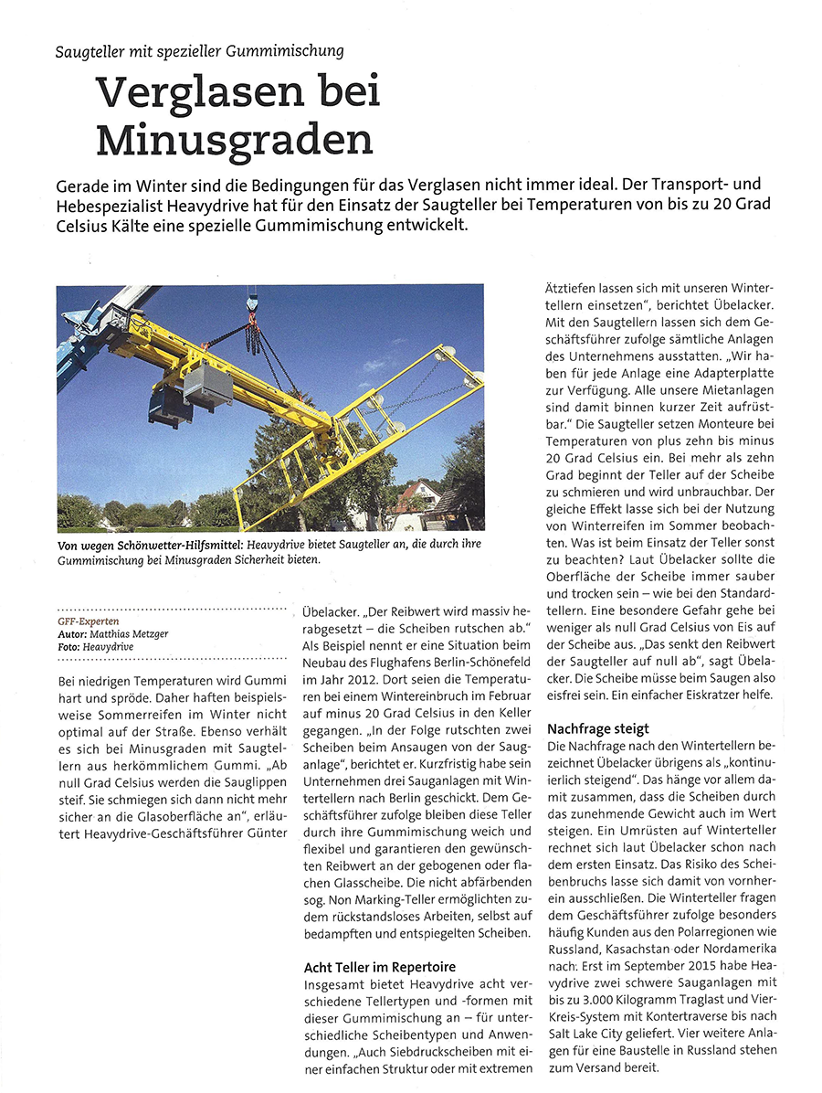 GFF, the practical magazine for production and assembly, reports on our suction cups for glazing in sub-zero temperatures in its 3/2016 issue.