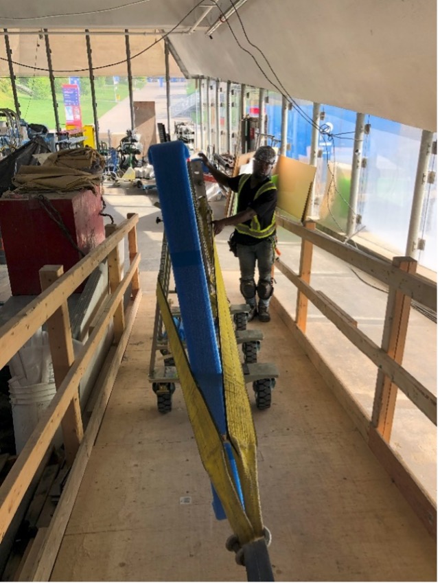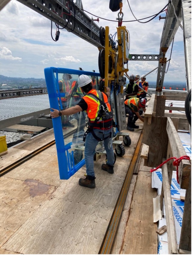 The visitor areas of the Tour de Montréal in the Olympic Park (Montreal, Canada) are being renovated and remodelled. Heavydrive supplied Montreal-based Matériel de levage Inc. with six HDL 700 A pneumatic tyres, as well as a custom-built version of the glass transport trolley, to install the glass elements for the fall protection system on the viewing platform at a height of 165 metres.